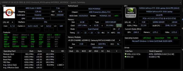 Hardware: Asus Vivobook 15 Pro, M3500QC (Ryzen 5600H, RTX 3050, 16 GB LPDDR4 3200 MHz).