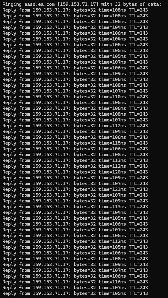 My connection is completely stable (0% packet loss, 105 ms average ping, tested via tracert easo.ea.com).