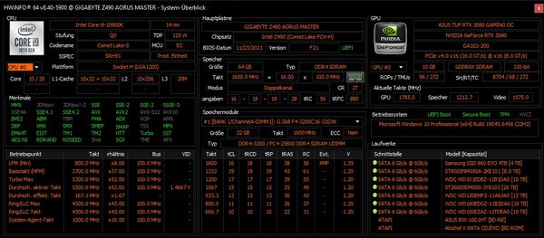 Intel(R) Core(TM) i9-10900K CPU @ max. 5.30GHz, max. 5300 MHz, 10 cores, 20 logical processors