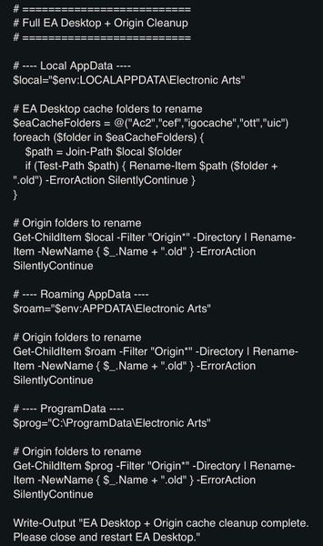 I’m looking for a safe PowerShell script that resets all EA Desktop cache folders (Ac2, cef, igocache, ott, uic), renames or clears any leftover Origin folders in LocalAppData, Roaming, and ProgramData, and does not delete my games or cloud saves.