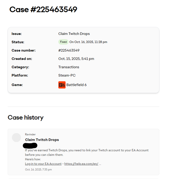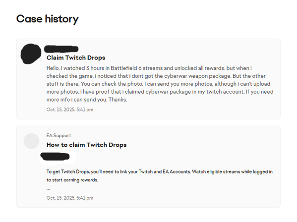 About two months ago, I successfully participated in a Twitch Drop campaigns (BF6) and completed all the necessary requirements to earn a reward. Although I was notified that the reward was secured, I could not verify its delivery at the time because the game had not yet launched.