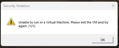 Unable to run in a Virtual Machine. Please exit the VM and try again. (121)