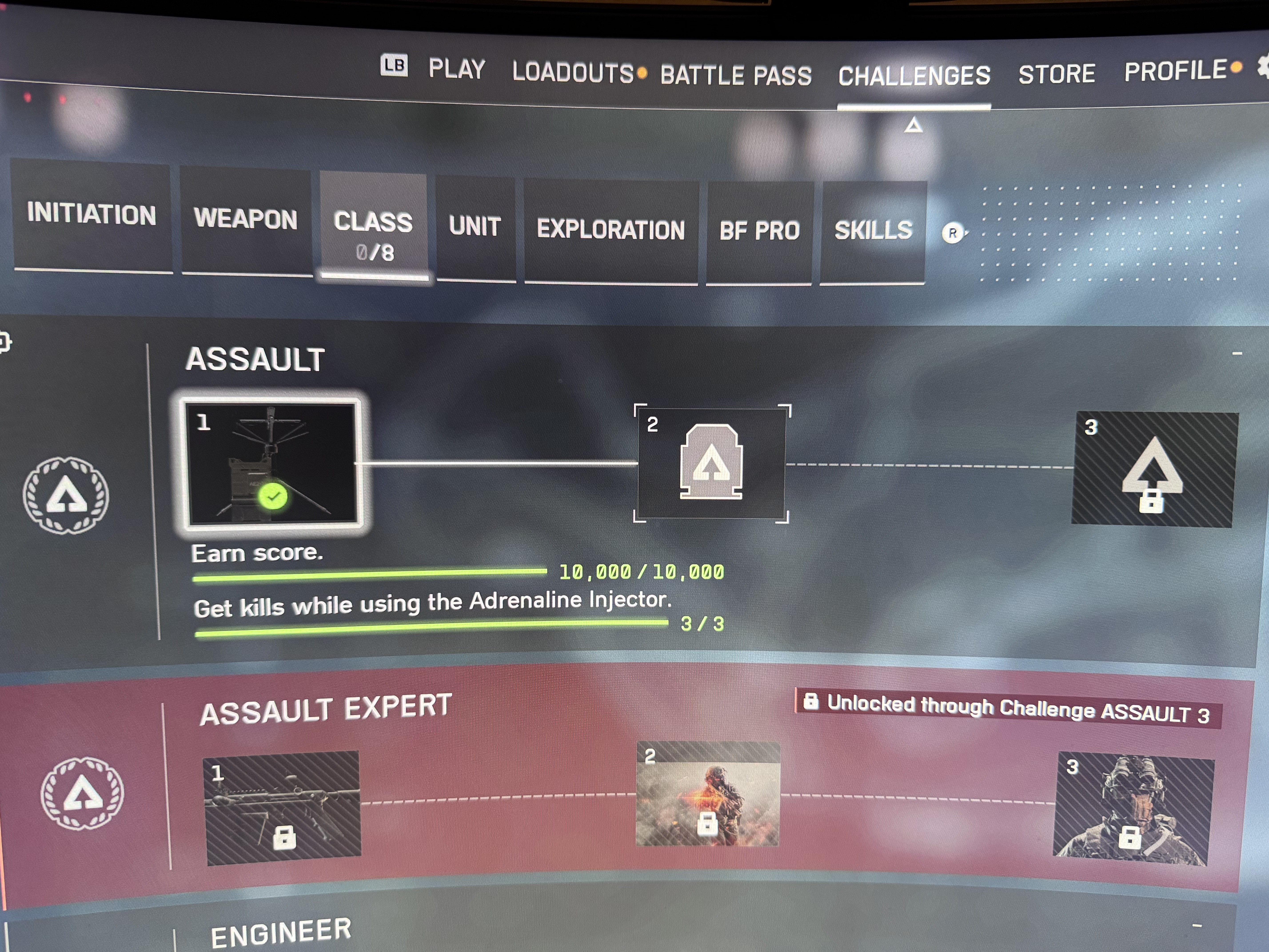 Uninstalled the game, restarted the game, went back and completed 50+ Adrenaline Injector assaults - current requirement is 3 to progress in the challenge. I think previously it was 30 so I wanted to make certain I had at least 30 to see if that was the issue. Still locked...