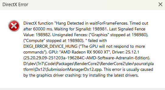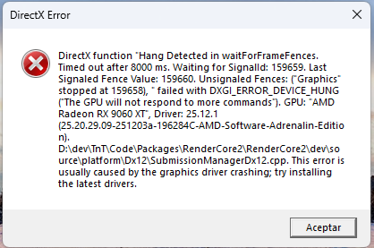 Como mínimo un par de veces al día el juego falla y se va al escritorio mostrando un mensaje Dx12 con diferentes textos ( según lo que esté probando en ese momento para evitarlo), desde que la gráfica se ha desconectado, que la gráfica no ha respondido en determinado número de milisegundos, etc.