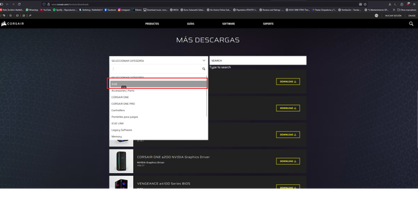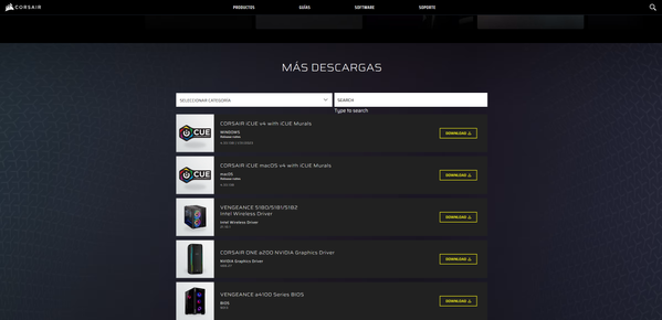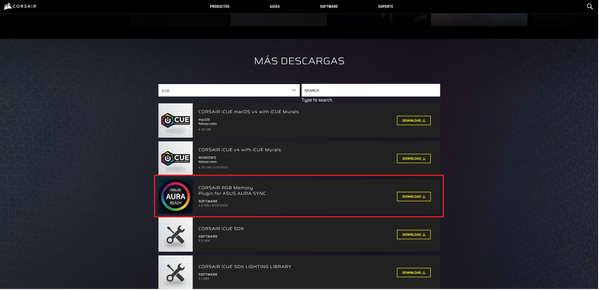 Al ingresar a la página, bajas hasta donde dice Más Descargas y aplicas filtro, seleccionas iCue y al filtrar te va a aparecer el plugin de Asus