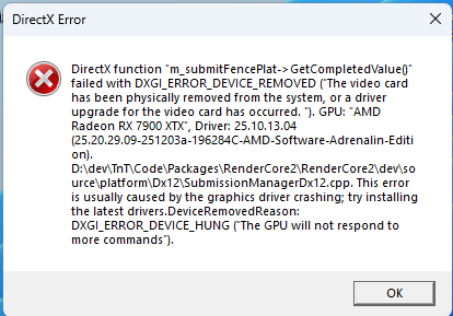 Brief summary of your bug: I'm playing normally when suddenly the game crashes, kicks me out, and tells me that the graphics card has been disconnected. It happens unpredictably, but it's been occurring very frequently in the last few days and is affecting my gaming experience.
