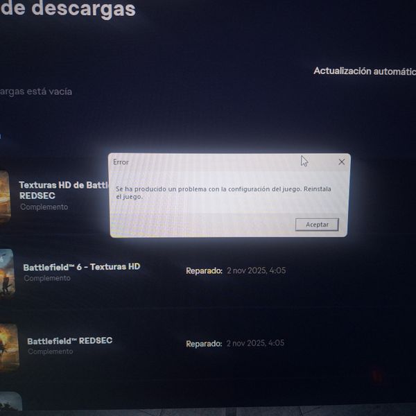 La semana pasada compré Battlefield 6, canjee la clave en EA APP y estuve jugando por unas horas 3 o 4, sin embargo tras la actualización a 1.1.1.0 apareció una ventana en la que ponía que la configuración estaba mal y el juego no cargaba. Adjunto foto.