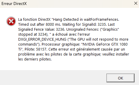 Voici une photo (avec portable car impossible de screenshot, le pc étant freeze et ce fermant 1 sec après l'apparition de la popup) et en p.j mon DxDiag.