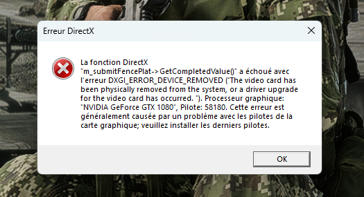 Erreur sur lancement partie DXGI_ERROR_DEVICE_REMOVED