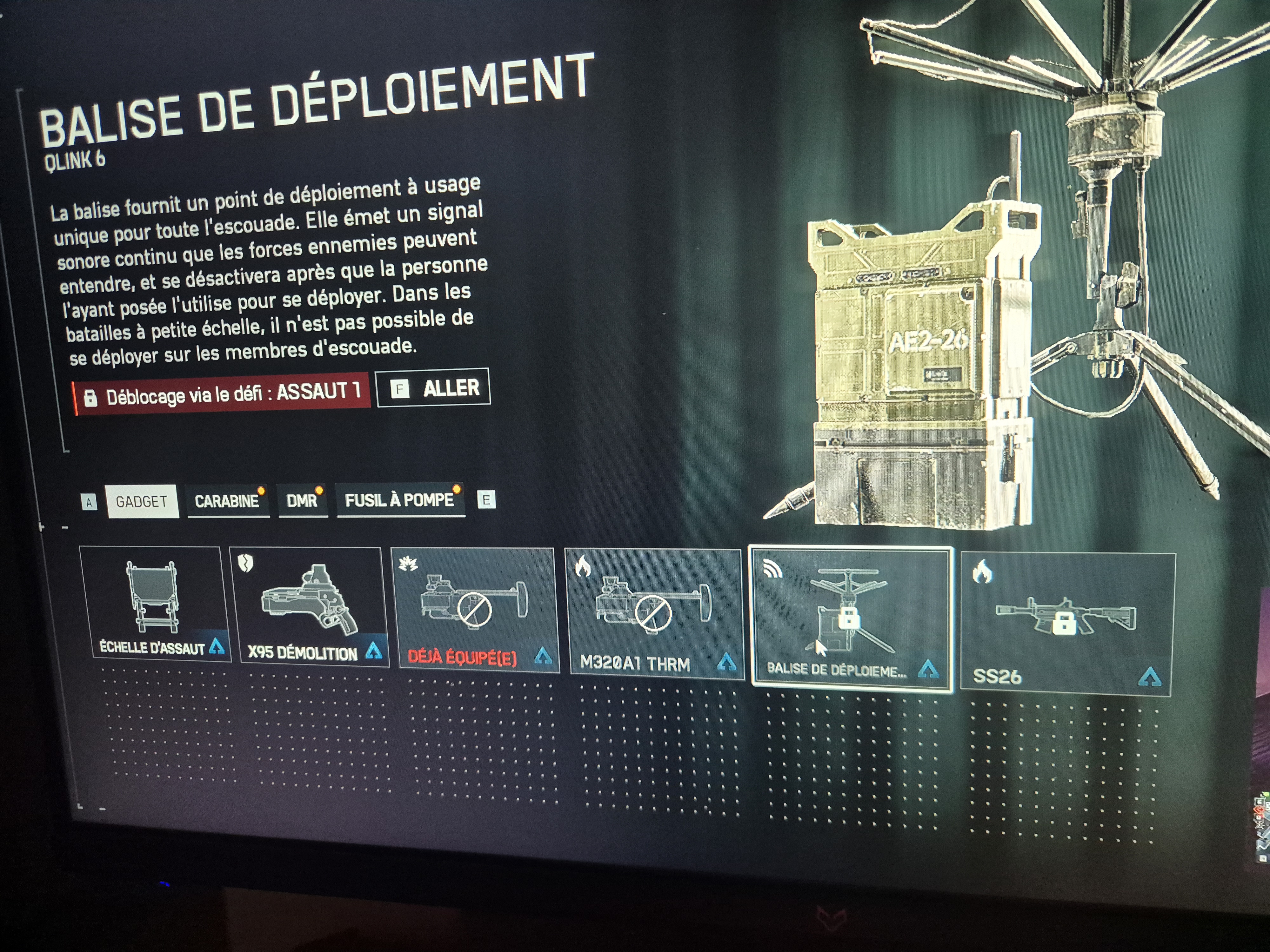 J'ai terminer toutes les taches demander pour débloquer la balise de redéploiement sur BF6 mais malgré que les deux missions soit intégralement remplis et que j'ai même pu commencer la tache assaut 2 avec la tache qui consiste a flasher un ennemie avant de le tuer , mais malgré cela je n'est pas accès a la balise de reploiement. Quand j'essaye de l'équiper que se soit dans gadget 1 ou 2 elle est marqué comme encore bloquer et me renvoie vers la Tache Assaut 1 que j'ai donc déjà terminer .