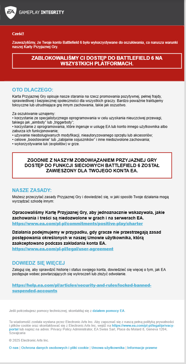 Cześć. Otrzymałem blokadę na Battlefield 6 za rzekome wspomaganie gry, jednak nigdy nie używałem żadnych cheatów ani programów zewnętrznych. Odwołałem się od decyzji, ale odpowiedź została odrzucona bez podania jakichkolwiek konkretów. Nadal nie wiem, za co dokładnie dostałem bana, kiedy miało to miejsce i na podstawie jakich dowodów została podjęta decyzja. Obecnie trwa darmowy weekend z Battlefield 6, a ja nie mogę w ogóle korzystać z gry ani zdobywać postępu, mimo że nie przedstawiono mi żadnych jasnych informacji uzasadniających sankcję. Proszę o szczegółowe wyjaśnienie powodu blokady, ponieważ jako konsument mam prawo wiedzieć, czego dotyczy ograniczenie dostępu do produktu i jakie dowody zostały użyte. Jeżeli nie otrzymam pełnej i konkretnej odpowiedzi, będę zmuszony zgłosić sprawę do UOKiK, ponieważ brak transparentności dotyczącej podstawy blokady narusza prawa użytkownika.