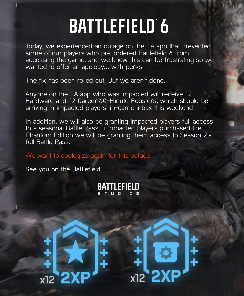 Zakupiłem przedpremierowo wersję Phantom Edition gry Battlefield 6 przez platformę EA App. Zgodnie z opisem produktu oraz Państwa komunikatami dot. problemów z premierą (tzw. outage EA App) osoby w mojej sytuacji miały otrzymać: