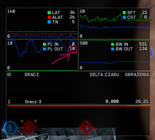 W Battlefield, na wykresie sieci mamy oznaczenie "PL IN" (pakiety wysyłane do serwera) oraz "PL OUT" (pakiety docierające do nas). W momencie pojawienia się ikon opóźnienia, wartości te gwałtownie rosną.