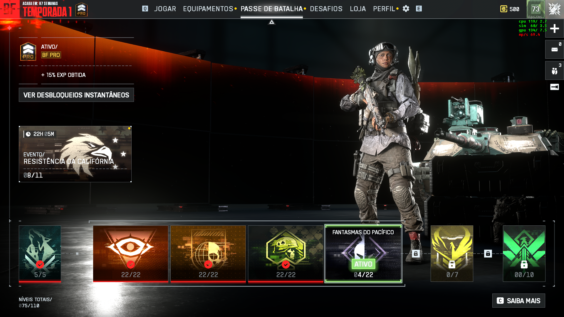 Anexo seguem o print que o BF Pro está ativo na minha conta e os itens que constatei que faltam dos desbloqueios instantâneos do BF Pro (ainda não chequei se recebi todos os itens do Passe de Batalha)