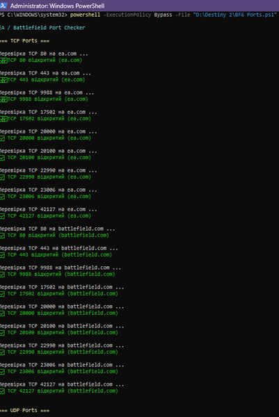 Здоров усім, у мене мабуть проблема у інтернет провайдері, вчора написав швидко скрипт, протестував порти котрі використовує гра, вони у мене закриті як бачите: