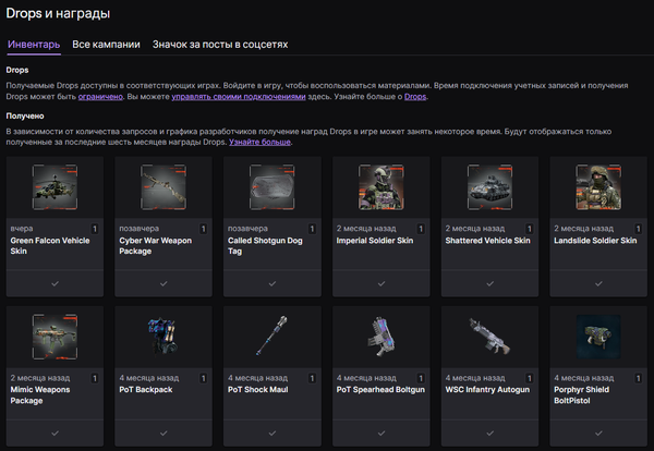 Я не получил награды Twitch Drops, хотя и получил их, а именно: Облик солдата Империи: Shattered Vehicle Облик солдата: Landslide Облик солдата: Mimic Weapons Все это было в августе во время бета-тестирования. можете мне их выдать ведь я их получил а в игре их нет то что обведено
