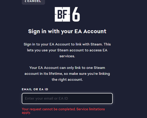 Изначально я думал, что  пароль ввожу не правильно, или Steam не хочет логинится с ЕA. Я даже аккаунт думал создать новый и то не получалось, просто не приходил код подтверждения на почту. Через время просто подключил VPN и всё зашло с первого раза.