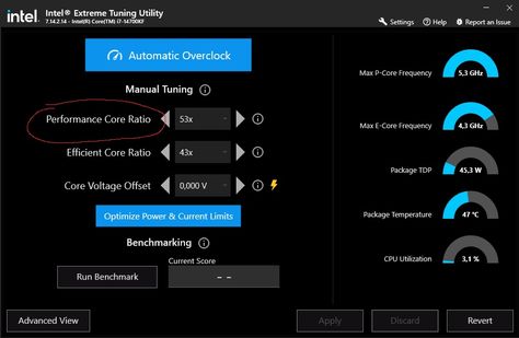 - Установите Perfomance Core Ratio на два значения ниже. (Допустим у меня было значение 55x, стало 53x).