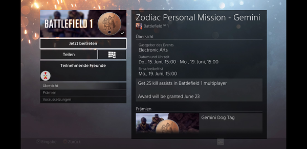 - "Road to Battlefield 1"-Missionen in Battlefield 4 oder Battlefield Hardline abgeschlossen