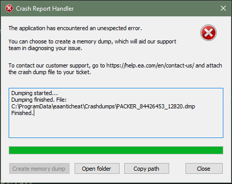 Upon launch EA Anti-Cheat crashes, creating a dump file.