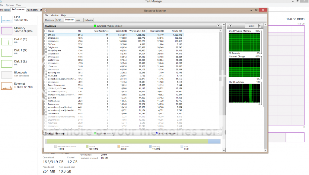 I have a strange issue. out of 12GB of ram, 94% is pegged but it shows no process taking it up, it happens about 20 minutes into game and it gets really choppy. BF4 seems to be eating it up but I'm not sure for what.. When going into task manager, it won't show a single program taking the memory.. it's leaking and ruining my game!
