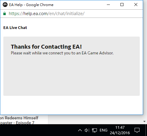 I tried to purchase BF1 yesterday since is 50% off or something, but i couldn't. I made a case (#27747994) asking for help with that yesterday and i started a live chat the next day. They didn't respond for the first hour so I left the computer on and went afk. I just come back home and it is still "Thanks for Contacting EA! Please wait while we connect you to an EA Game Advisor.". I don't know when the sale is going to end and I'm worried that i will miss the sale (I know that maybe I'm just over reacting). This is the first time I try contact EA for help and so far this is the worst online service I've ever experience. I just want some help, anyone?