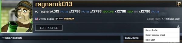 - Click the small triangle in the top, right-hand corner of this menu and select Report Cheater, or Report Profile.