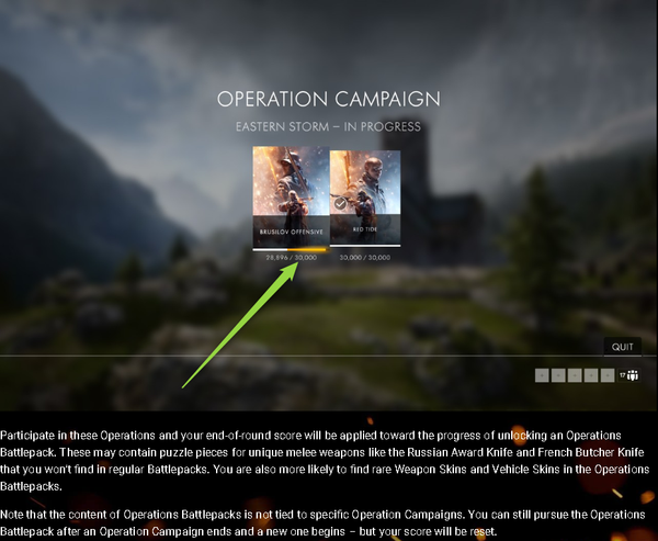 To summarize an Operations Campaign strings together 2 Operations, completing such a Campaign requires you to achieve a certain score on each of these Operations, so in below example you would need to accumulate 30,000 points in each Brusilov Offensive and Red Tide. So in the example below Operation Brusilov Offensive has been played twice after which the score accumulates to 28,896, so it would need a third time to complete the 30,000. If you now would play it for the third time and quit before the Operation is finished your score will not accumulate further towards the 30,000, but all other progress which you made during the Operation in terms of stats is recorded.