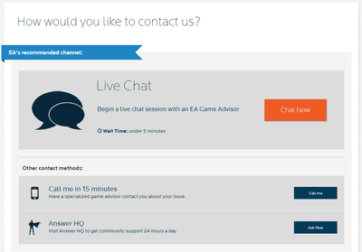 4) Select the way in which you would like to contact EA. (Options may vary depending on the problem you're having, and your location.)