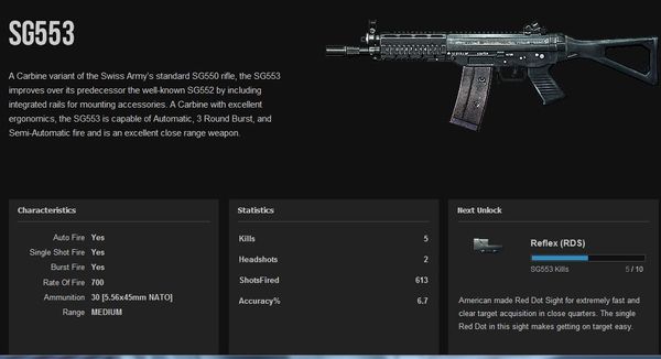 As you can see from the weapon screen, your next unlock will be the Reflex (RDS) scope for the SG553 in 5 kills.