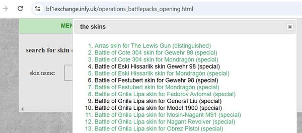 Puzzles are NOT taken into account here! Meaning the number would be higher still. But since you tend to get all pieces over time with the OP Battlepacks I excluded them from here. At least without the special rare melee weapons which are otherwise unobtainable like the Ararebo, Coupe Coupe, Arditi Dagger(still unobtainable, has never been seen in the exchange) and Barbed Wire Bat