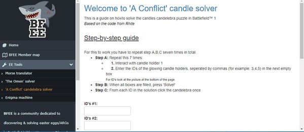 Ya hay bastantes tutoriales en la red para resolverlo y sin duda la mejor es esta herramienta que han creado la comunidad de BFEE, muy útil por cierto para saber la secuencia de los candelabros: Welcome to "A Conflict" Candle Solver. Esto es lo que tienes que hacer: