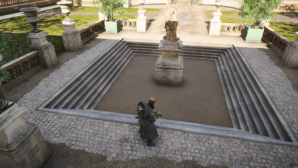 En el juego, sal del castillo y ve a la columna número 1 e interactúa dos veces. Tienes que agacharte para esto.