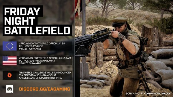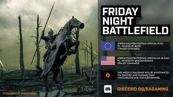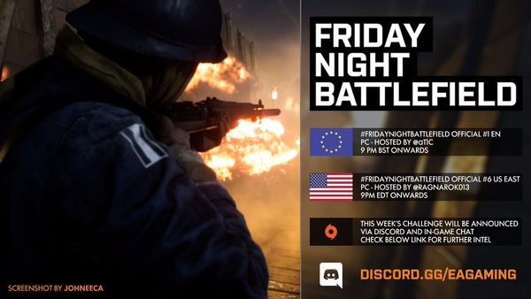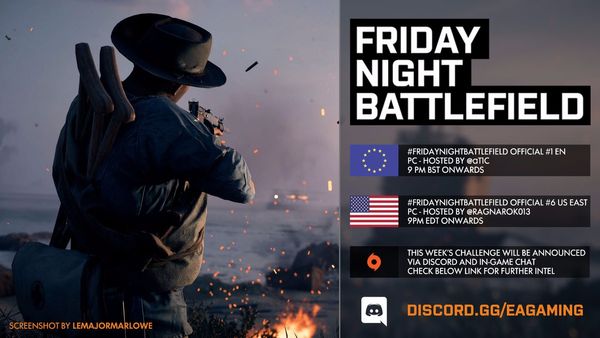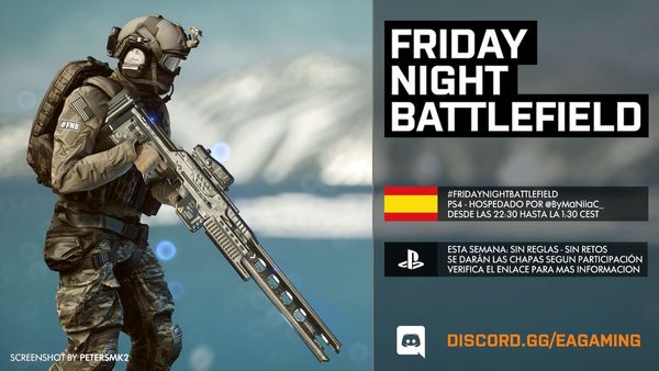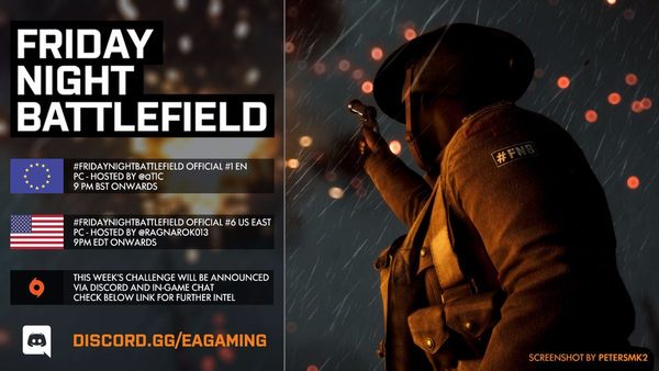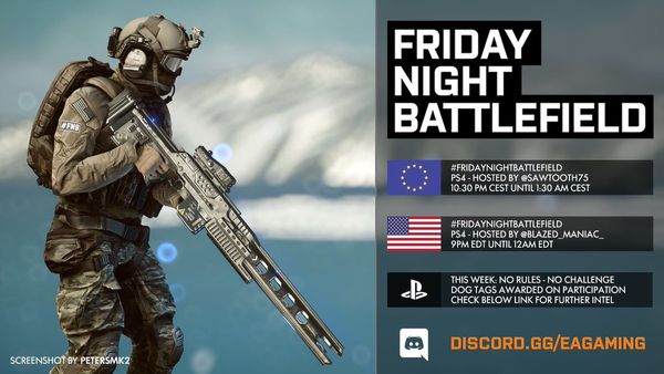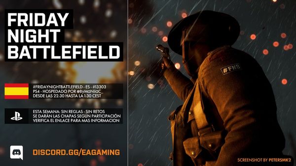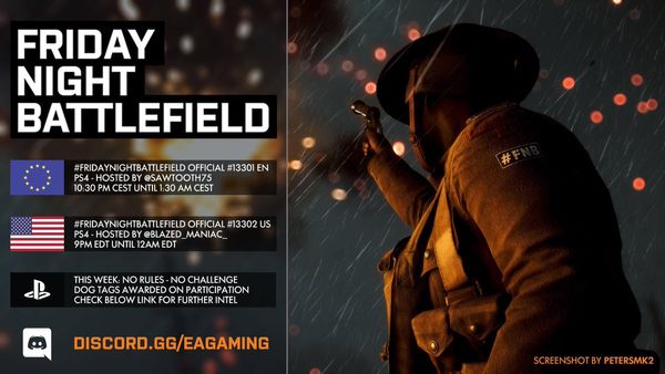 - PC: Il numero del server sarà pubblicato intorno le ore 21:30 CEST tramite QUESTO profilo Twitter e/o nel canale Discord EA Gaming: FRIDAYNIGHTBATTLEFIELD - pc
