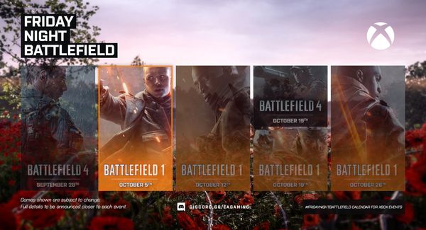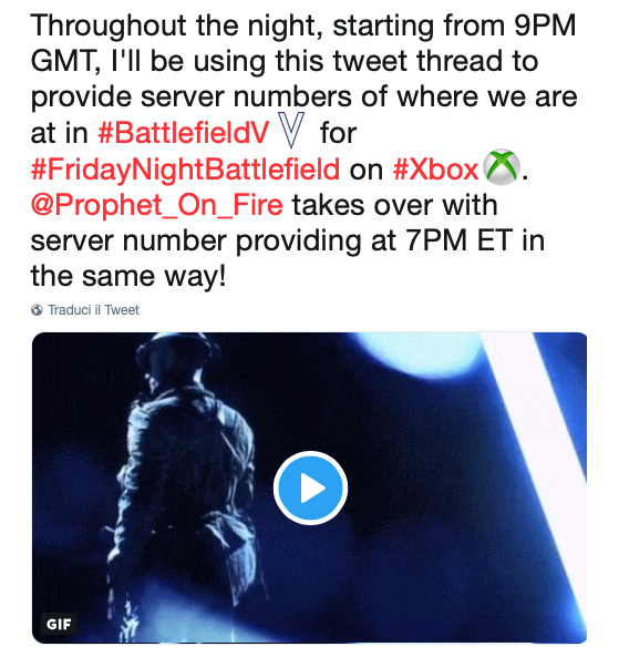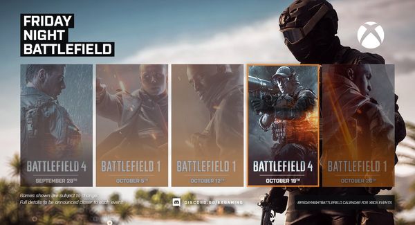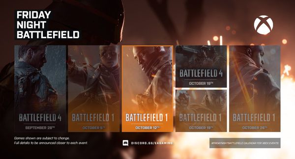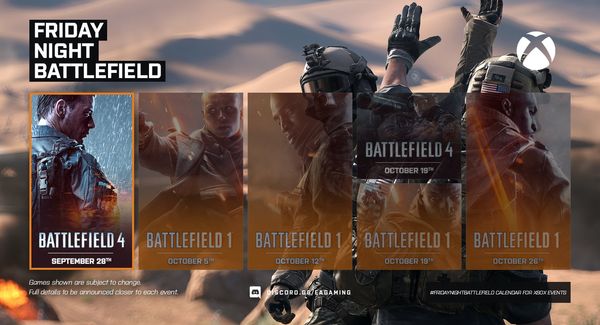 - XBOX: Il numero del server sarà pubblicato intorno le ore 21:30 CEST tramite QUESTO profilo Twitter e/o nel canale Discord EA Gaming: FRIDAYNIGHTBATTLEFIELD - xbox