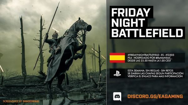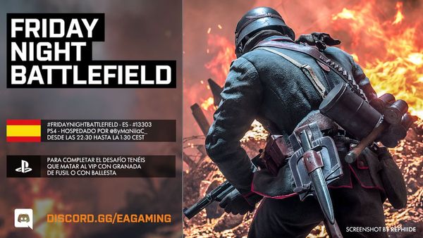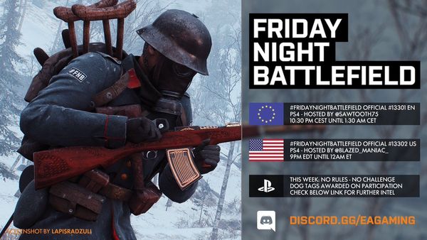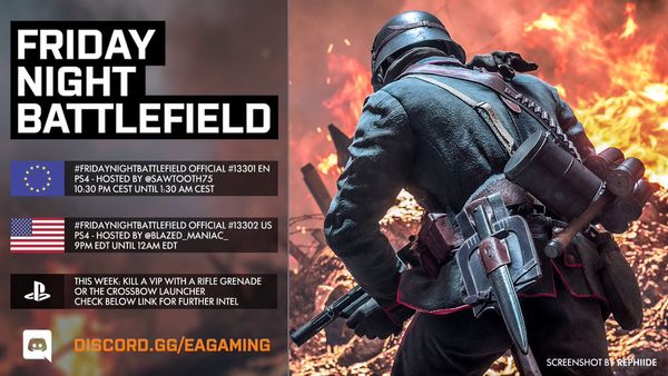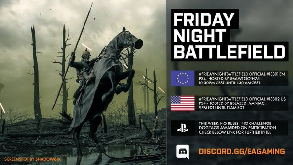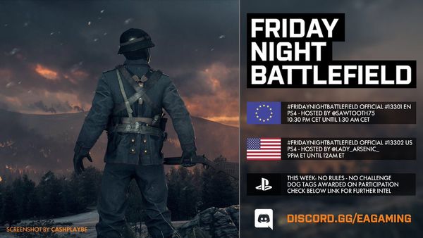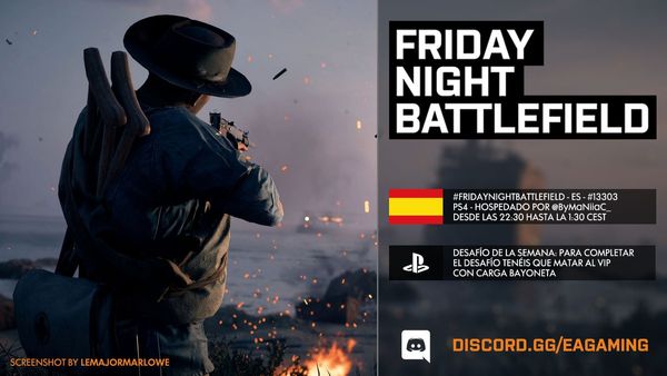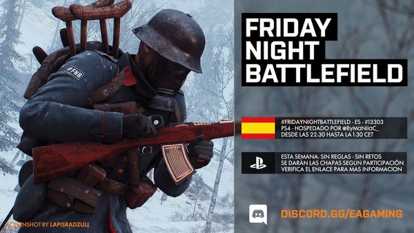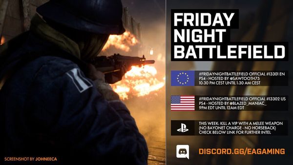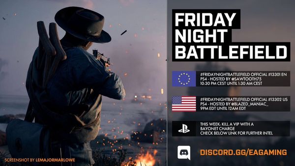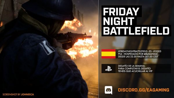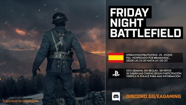 - PS4: Il numero del server sarà pubblicato intorno le ore 21:30 CEST tramite QUESTO profilo Twitter e/o nel canale Discord EA Gaming: FRIDAYNIGHTBATTLEFIELD - playstation