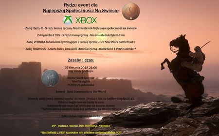 Cześć Powodzenie eventów na PS4 zaowocowało tym że organizuje event na Xbox i mam nadzieje że też zakończy się sukcesem. Dwóch z 4 VIP to przyjaciele DICE (VERNITA i ROWNISS) nie wykluczone że na s...