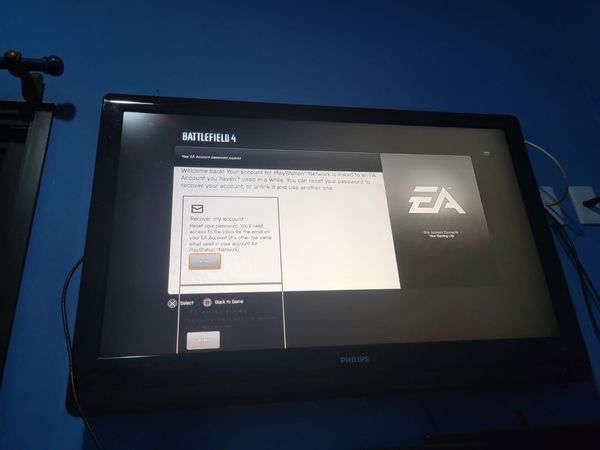 Tentei retornar ao BF4 depois de alguns anos sem jogar, mas ao entrar no jogo me deparei com o aviso na imagem, dizendo que minha conta PSN estava vinculada a uma conta EA antiga que deveria ser recuperada. A partir daí não consigo fazer mais nada, meus controles travam. Não consigo clicar nem em select nem em back to the game.