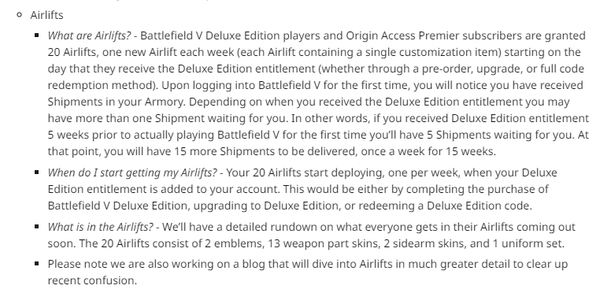 I have not yet to receive any of my airlifts. I was told to come on here to get them. I have only received unlocked skins from weapon progression. I have had the deluxe edition of the game since day one of release.