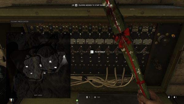 Then a third interaction prompt appears on an encryption machine located inside one of the buildings of the Japanese Conquest deployment (Deep Jungle). Holding the interaction button will play a Morse code message then make the prompt disappear. A few seconds later, Black Weapon's sound from Battlefield: Bad Company 2 will be heard in the whole level originating from the back of the deployment (East mountains).