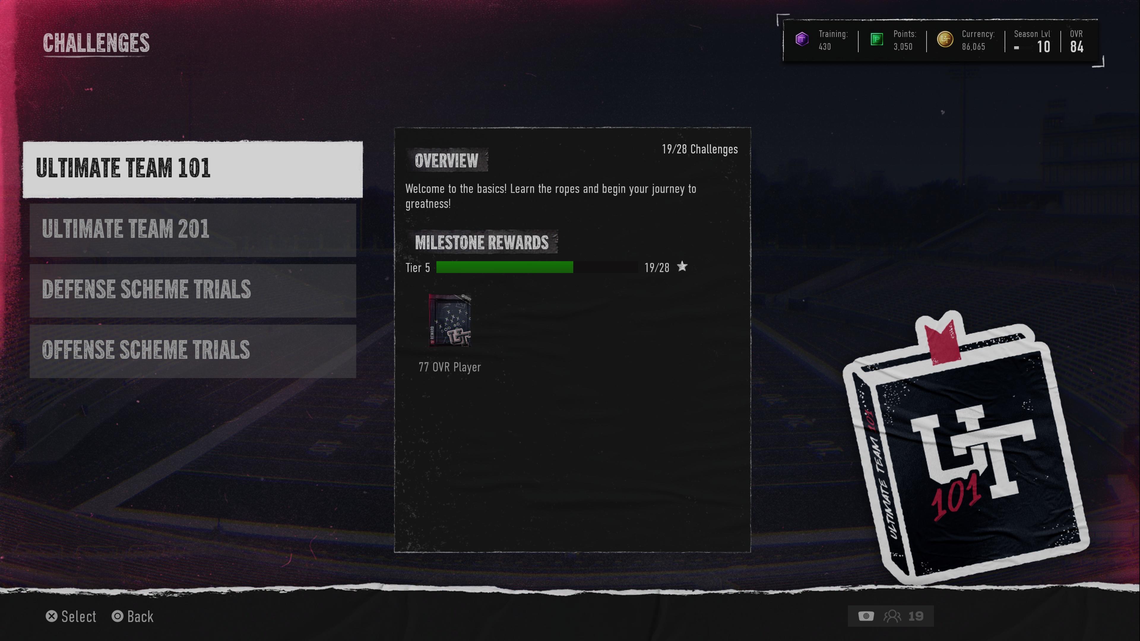 ** Showing that I only have Defense Scheme Trials, Ultimate Team 201, Ultimate Team 101 and Offense Scheme Trials - Challenges available
