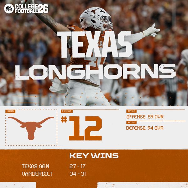 NatureBoy2323Hero+9 days agoCollege Football 26 - Week 14 Top 25 PollAre the Longhorns back? Our College Football Top 25 Poll thinks so! Check out all of this week's changes here: College Football 26 - Week 14 Top 25 Poll