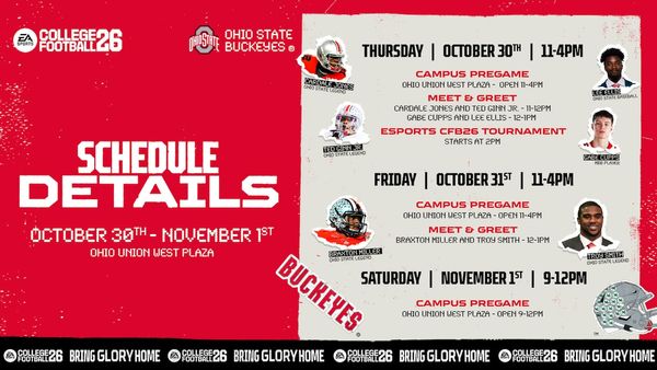 The third Campus Pregame stop is at THE Ohio State University in Columbus as the Buckeyes host longtime rivals the Penn State Nittany Lions. The festivities kick off on October 30 with a College Football 26 tailgate experience decked out in Buckeye scarlet and gray. Stop by the Ohio Union - West Plaza before the big game to hang out, play some College Football 26, and meet some OSU football legends like Braxton Miller, Cardale Jones, Ted Ginn Jr. and Troy Smith.