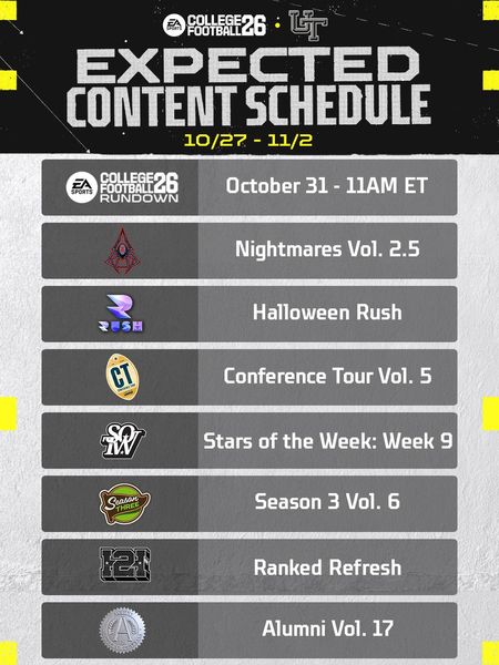 NatureBoy2323Hero+2 months agoExpected Content Schedule for College Football 26 Ultimate TeamFor the week of 10-27-11-2.