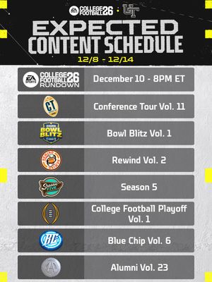 NatureBoy2323Hero+2 days agoExpected Content Schedule For College Football Ultimate Team For the Week of 12-8 - 12-14 We’re going live for a CFB Rundown Special to reveal Season 5 AND College Football Playoff Vol. 1! https://www.twitch.tv/easportscollege Show More