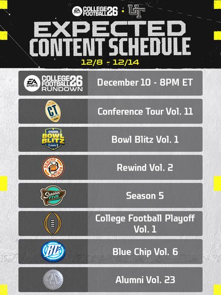 NatureBoy2323Hero+3 months agoExpected Content Schedule For College Football Ultimate Team For the Week of 12-8 - 12-14 We’re going live for a CFB Rundown Special to reveal Season 5 AND College Football Playoff Vol. 1! https://www.twitch.tv/easportscollege Show More