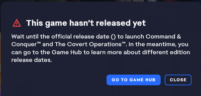 I had same issue but managed to get C&C Remastered to launch by selecting it in the EA App, clicking MANAGE, then View Properties and then adding -REDALERT to the Advanced launch options. After clicking OK to the admin prompt, the launcher successfully ran and allowed me to select my C&C original game or Red Alert.Hopefully this will work for others too until EA sort out the bugs in this awful EA app.