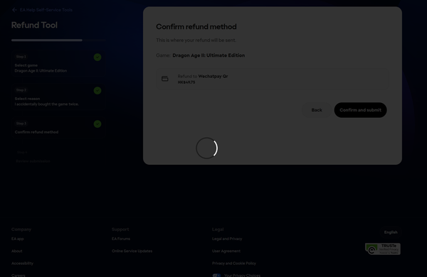 Hello, I just purchased Dragon Age II: Ultimate Edition on the EA App and I would like to request a refund. However, it is simply unbelievable that your refund tool has been broken — my refund request keeps getting stuck on the final step and just keeps loading endlessly.