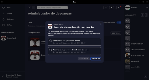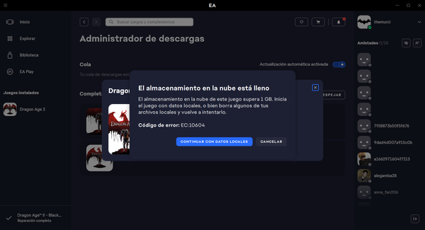 For the cloud error, try to clear your EA app cache, and if that alone don't helps move or delete old saves out of the game(s) "Save" folder. (DA2 save folder: "Documents\Bioware\Dragon Age 2\Characters". But you can also move/delete Saves from other EA games.)