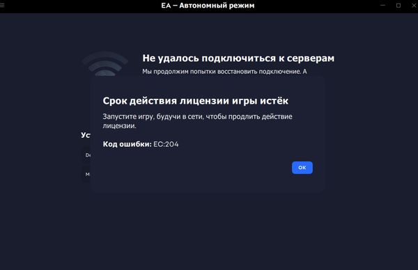 При попытке запуска игры при онлайн работе клиента EA App выскакивает сообщение о неполадках интернет-соединения, при попытке же запустить игру из автономного режима выскакивает сообщение о истёкшей лицензии. Читал на каком-то сайте, что бессрочная лицензия есть только у Dragon Age 2, но это сильно похоже на чушь, потому что после обязательного перехода на EA App игра работала исправно, только после очередного обновления лоунчера перестала запускаться.